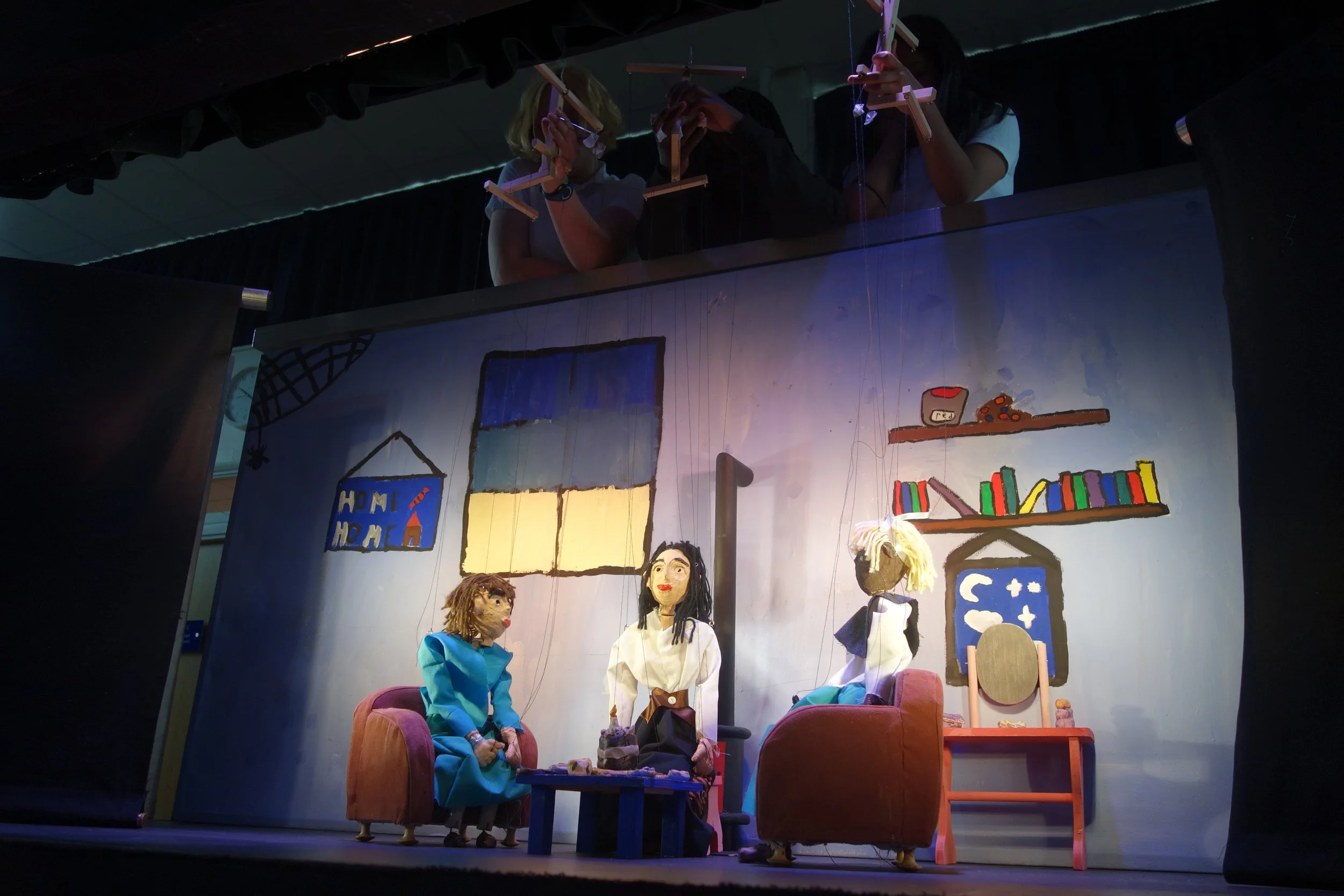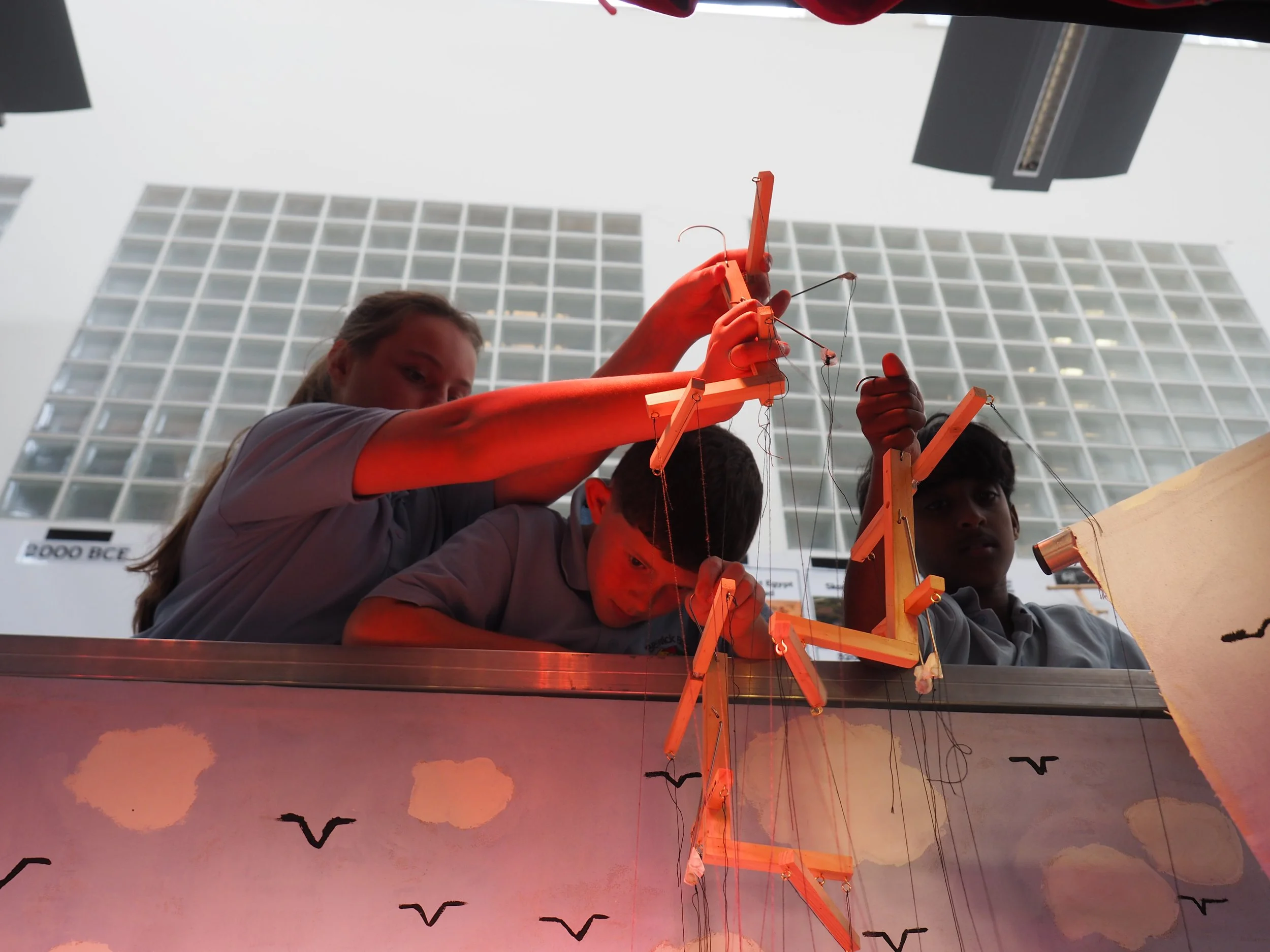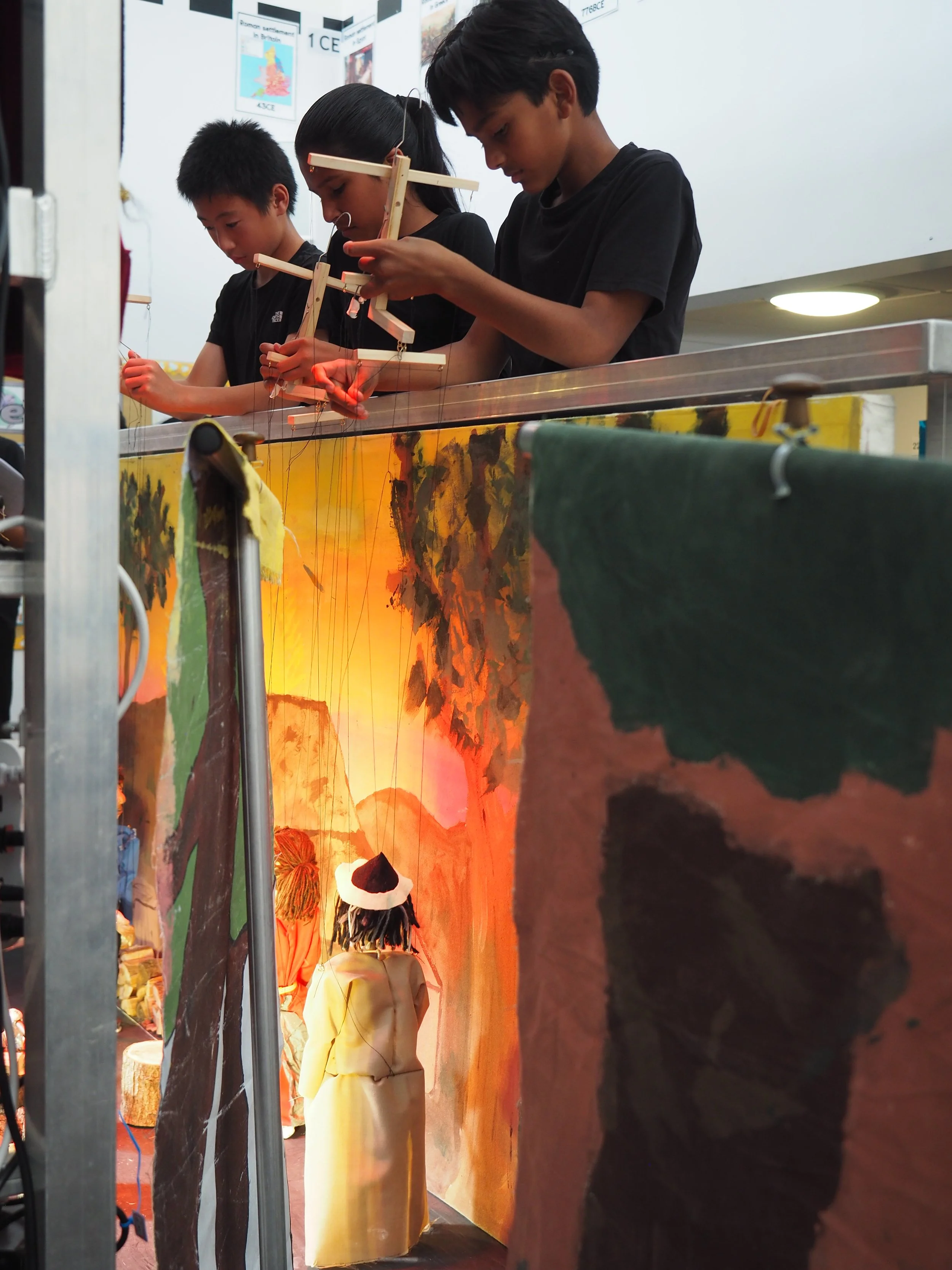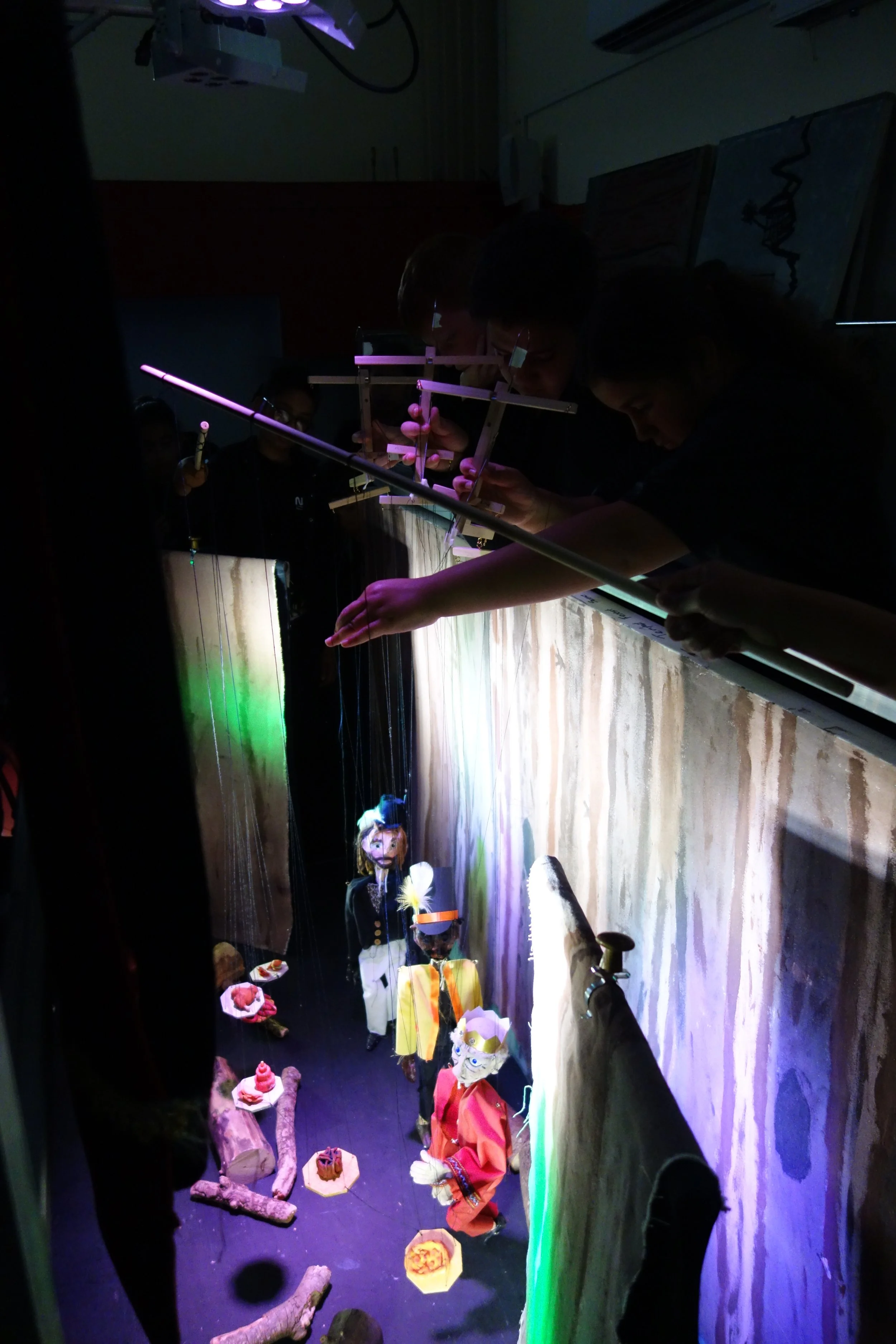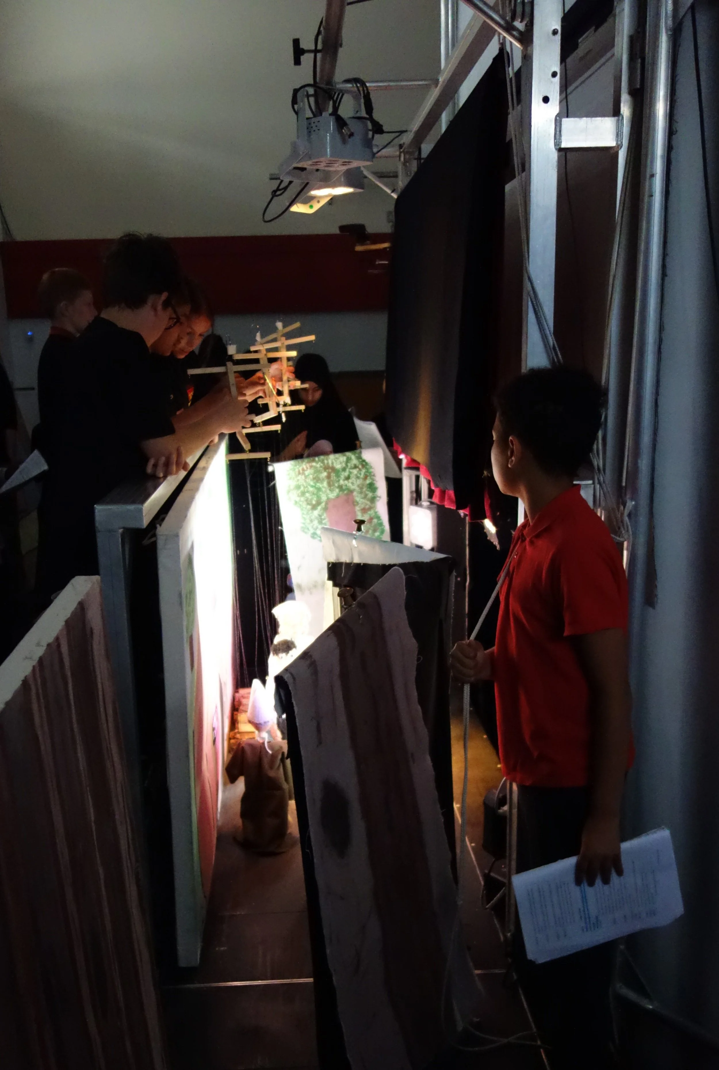 Children work together, learning to manipulate the puppets and operate our high-tech stages.