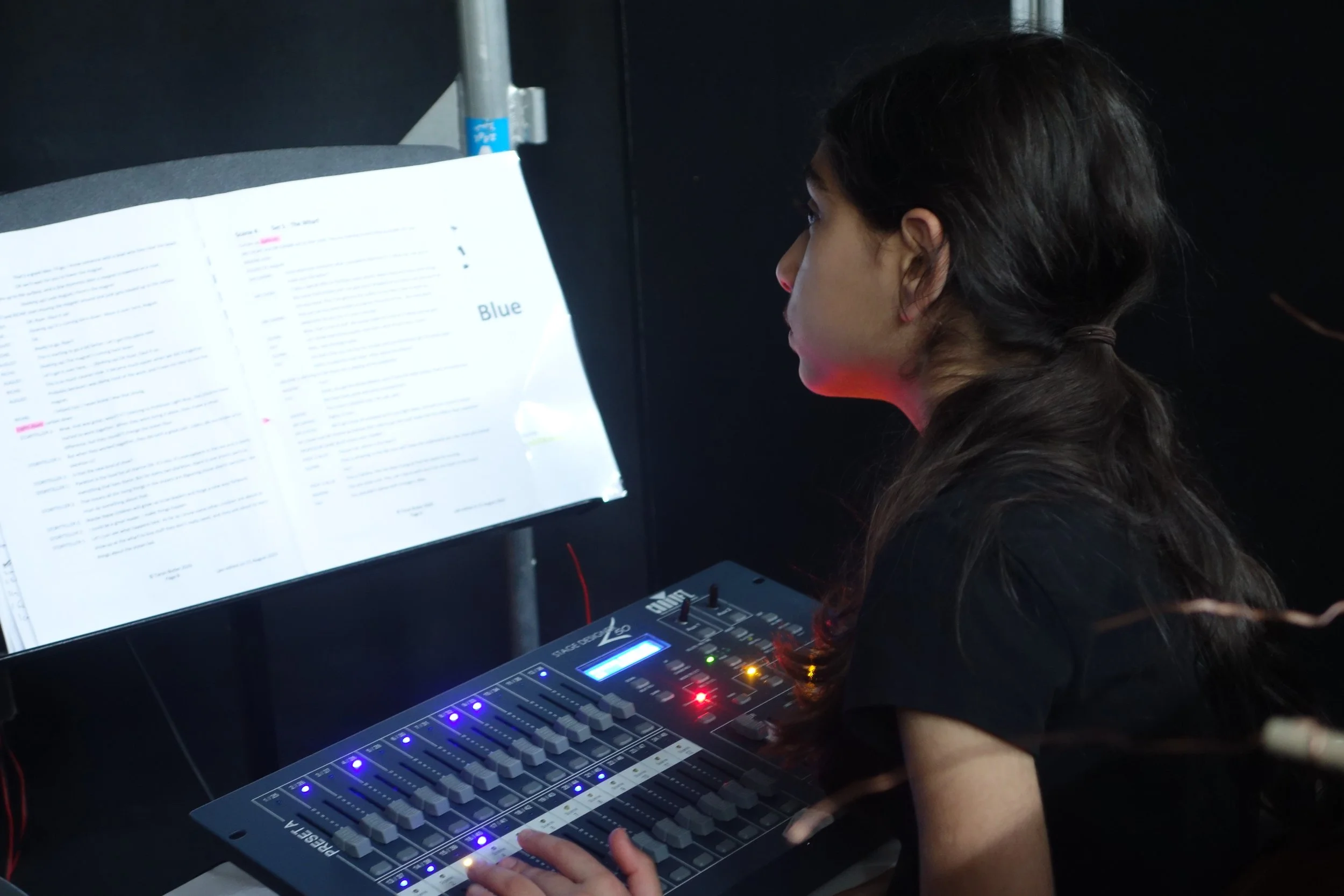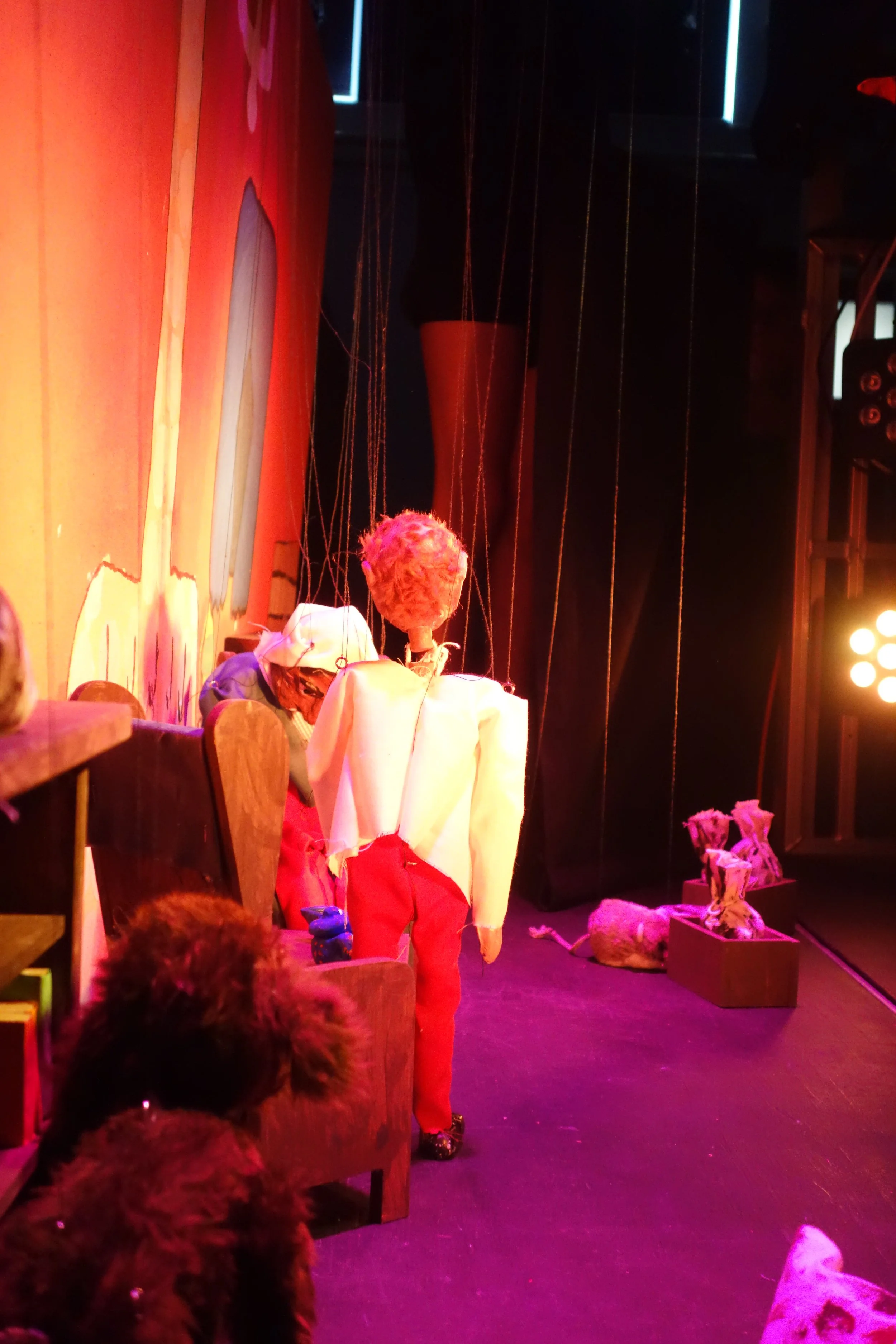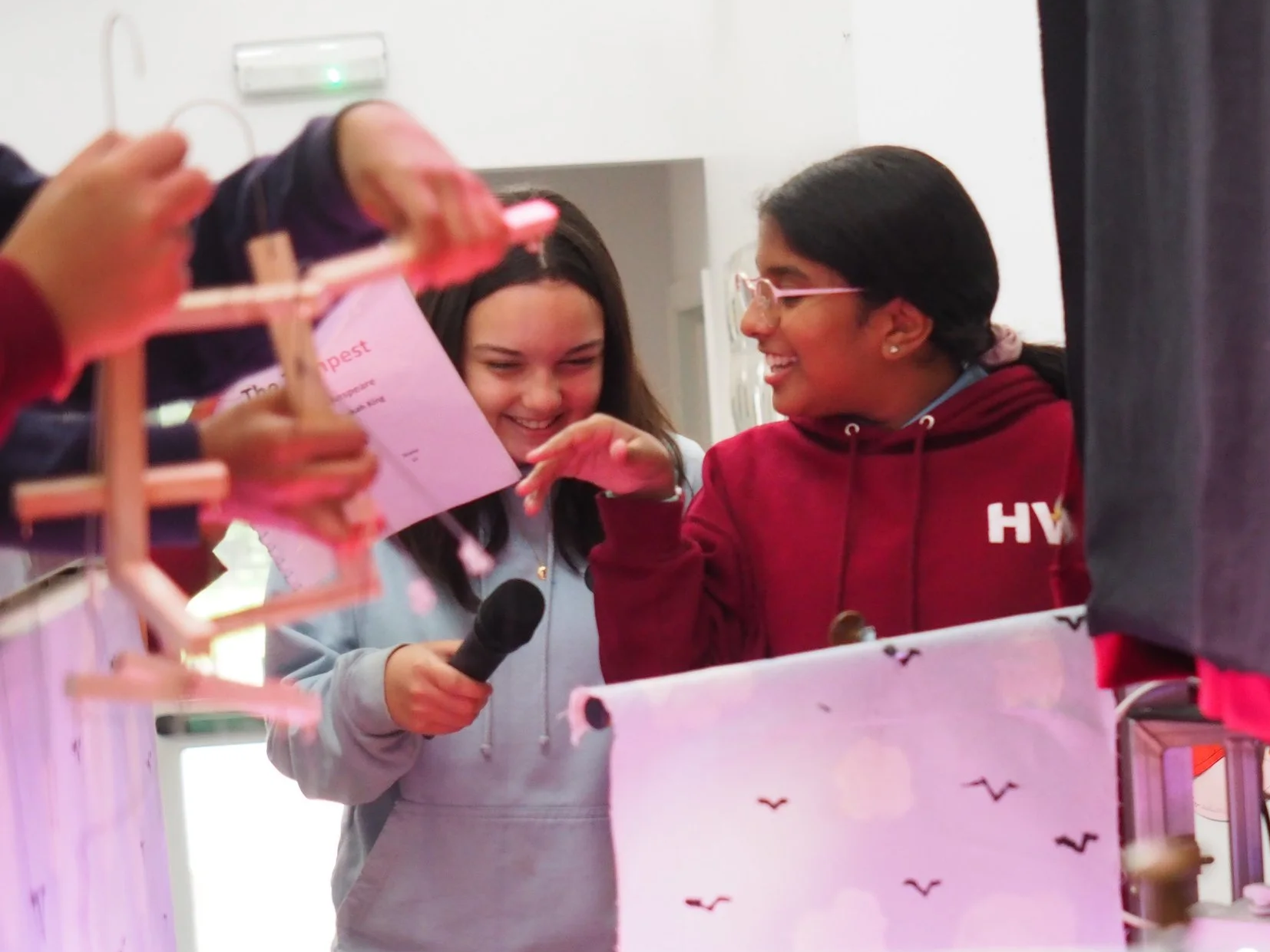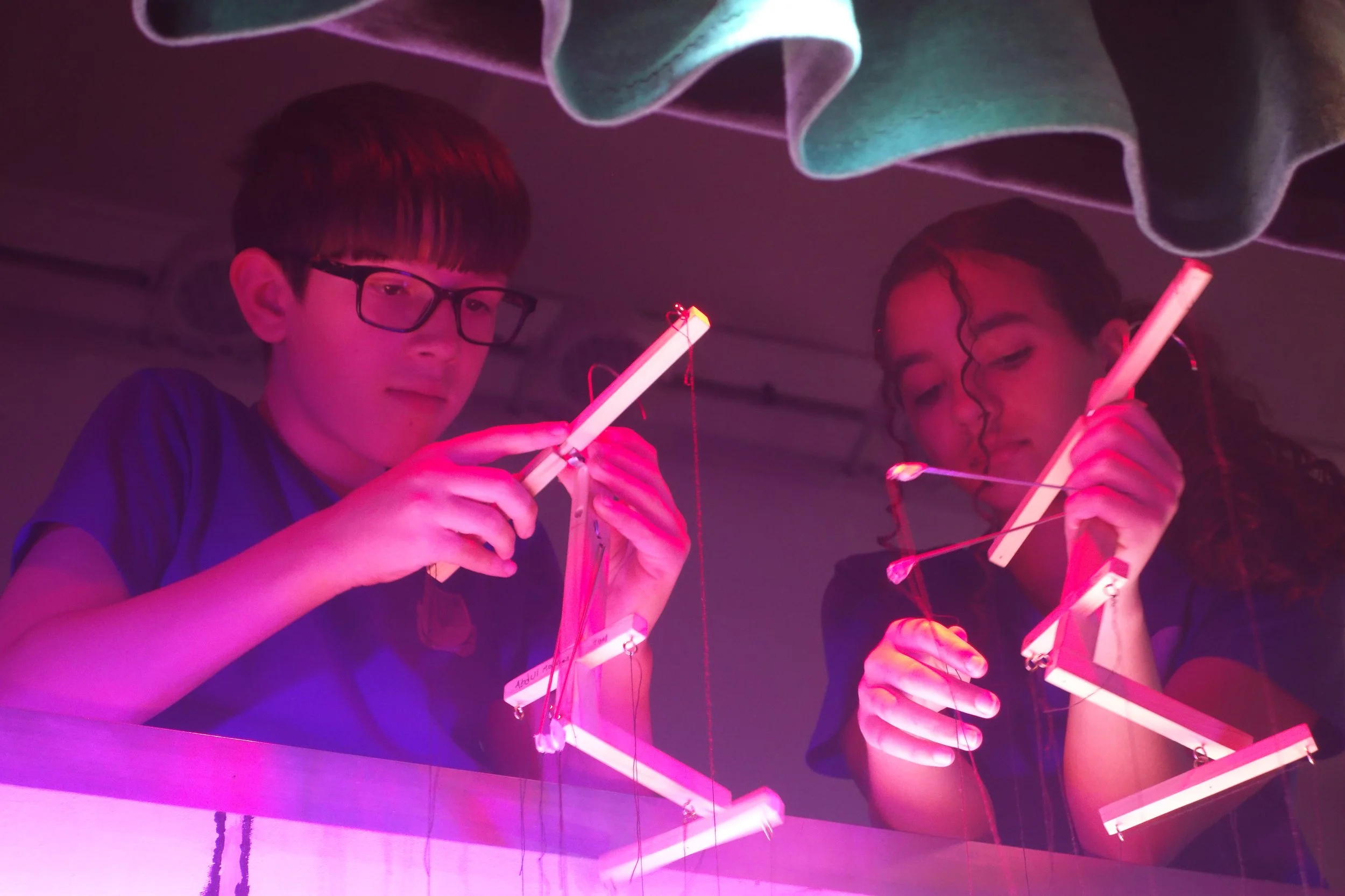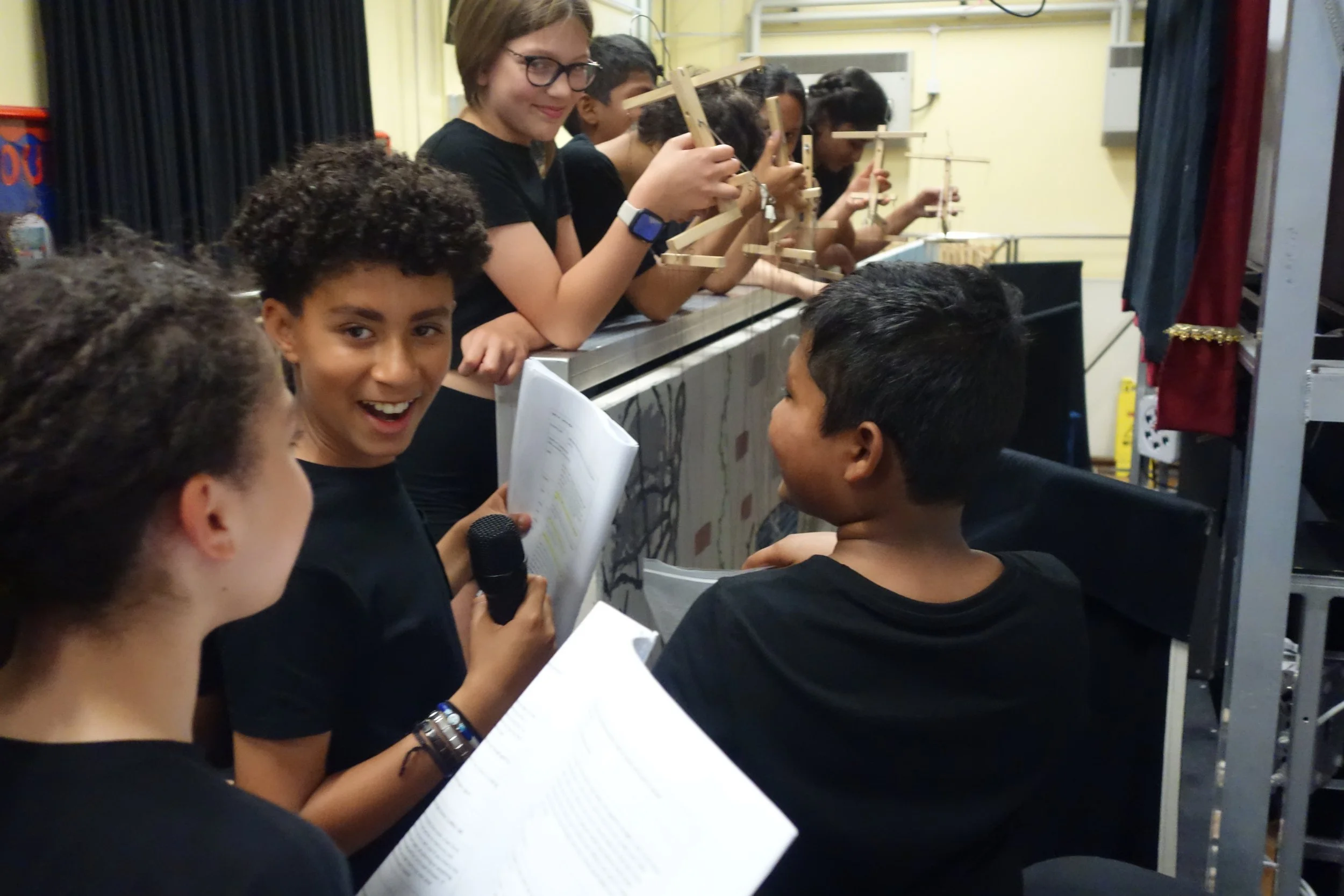 Children work together, learning to manipulate the puppets and operate our high-tech stages.